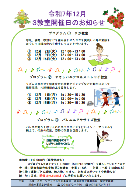 12月3教室開催日のお知らせ(ヨガ・エアロ・バレエ)